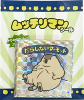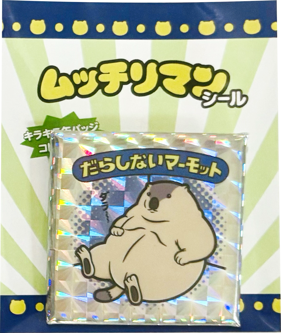 ムッチリマンシールのキラキラホログラム缶バッジです。